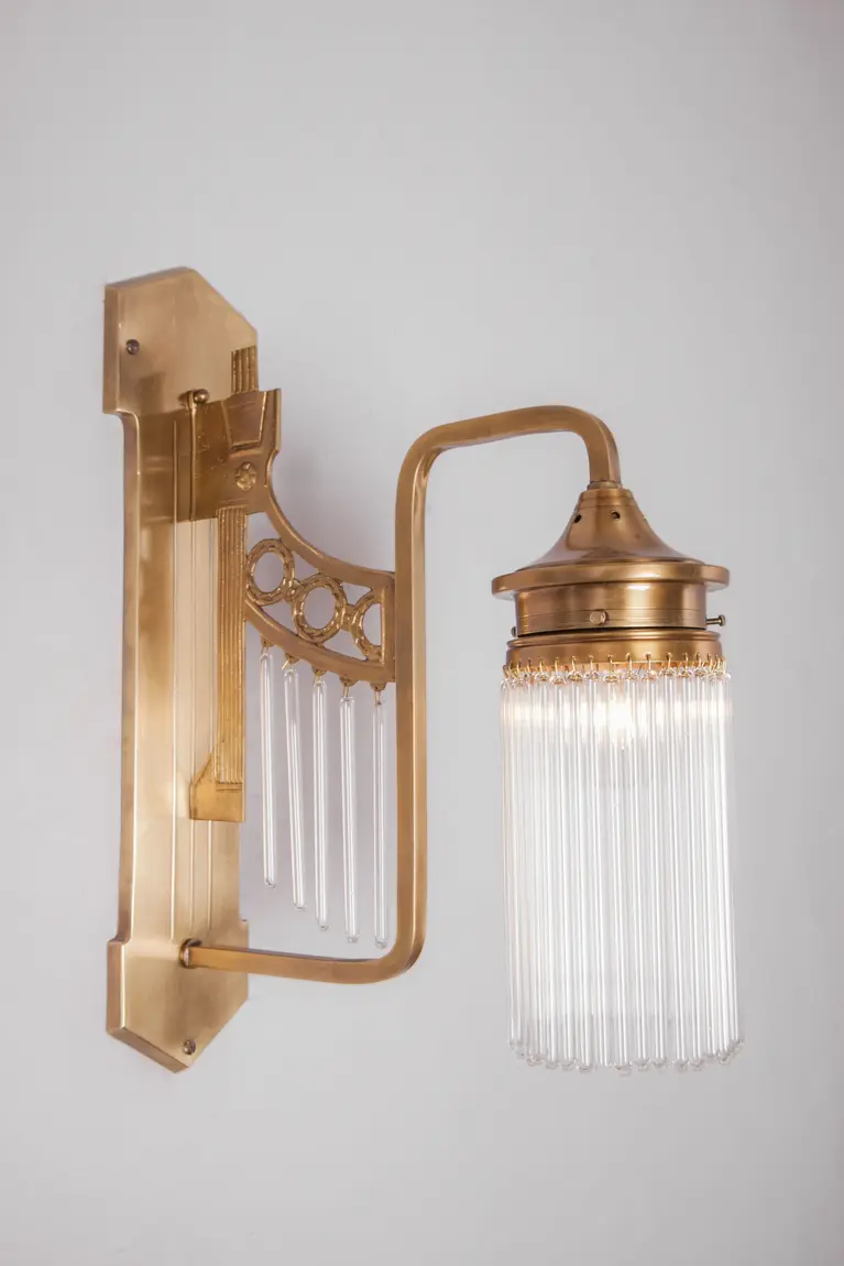 This grand, enchanting single wall light is a lovely decor of a similarly fabulous, big hall or restaurant, but it is also worthy companion of every Triest chandelier. The manually chiselled lamp is adorned with delicate leaf wreaths and 50 transparent, manually made delicate tubes which form a dense glass curtain. Once the light is on, wonderful reflections appear on its surface, resulting in magical atmosphere in the interior. The lamp is a unique, handmade Hungarian product. It is made of pure brass in shiny, antique and nickel finishes. Its E27 socket is a porcelain one, so it can be fitted with traditional and LED bulbs. Just like any other lamp with glass tubes, it is delivered with extra ones.Take a really close look at the lamp: it is, just like every lamp of ours, crafted with great care, just like a piece of jewellery. Our well-known trademark is proportionality, which took years to design and refine.In order to manufacture the lamp 14 to 16 work stages are required, depending on the finish. Handicraft technology is time consuming (some work stages take hours), it requires wide knowledge and expertise.