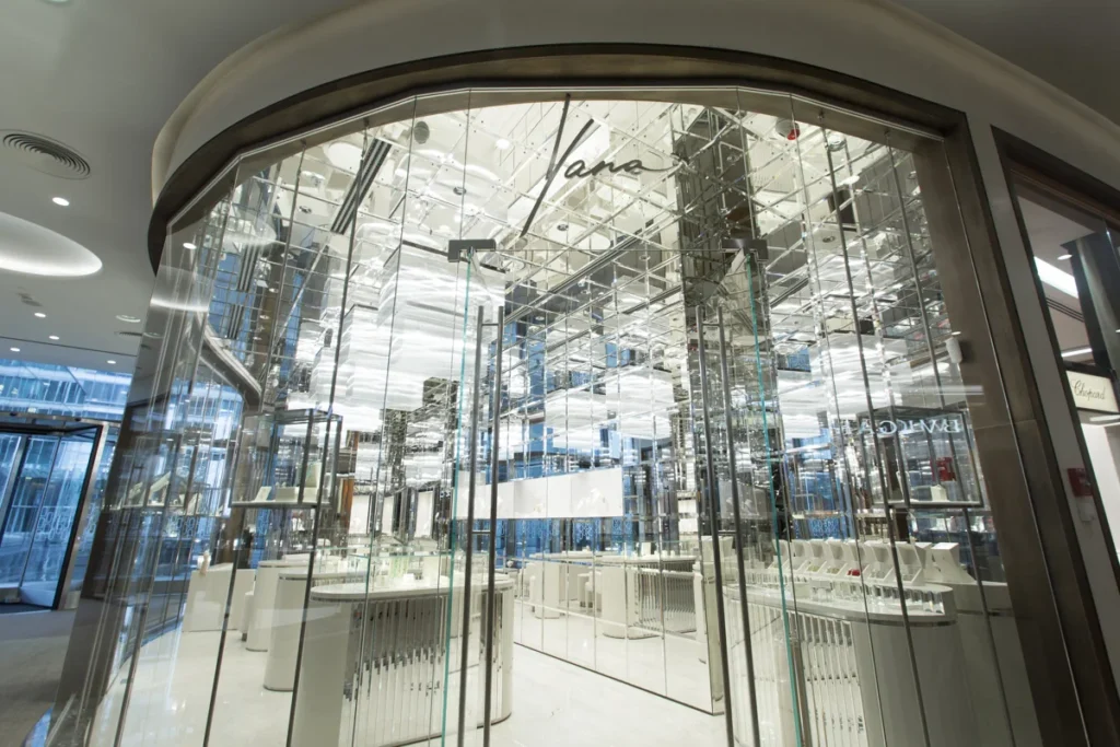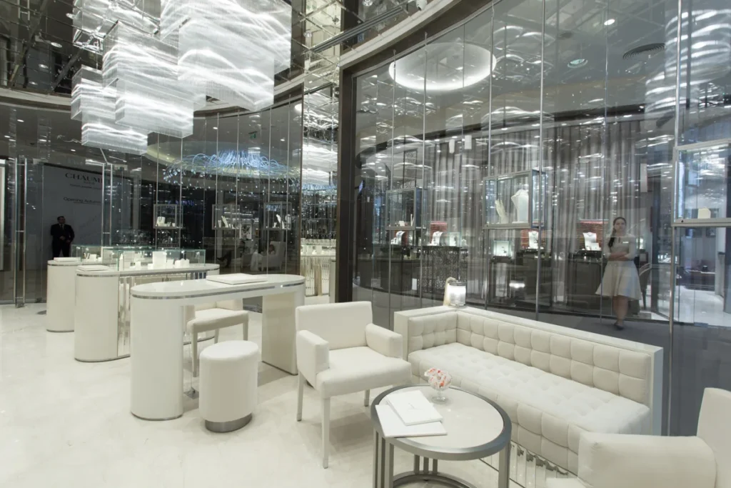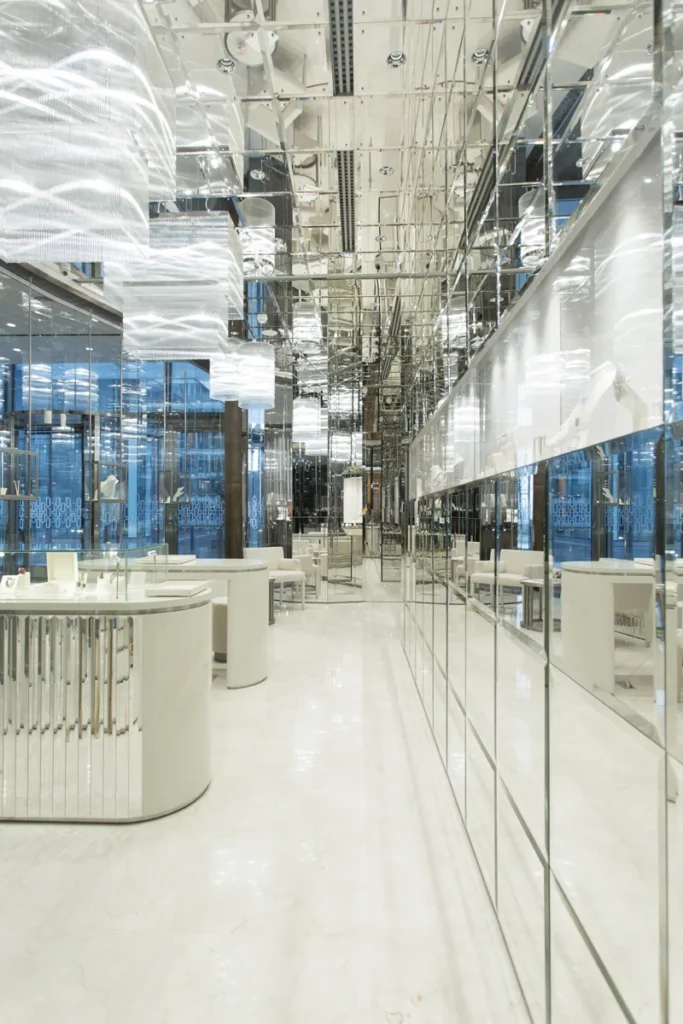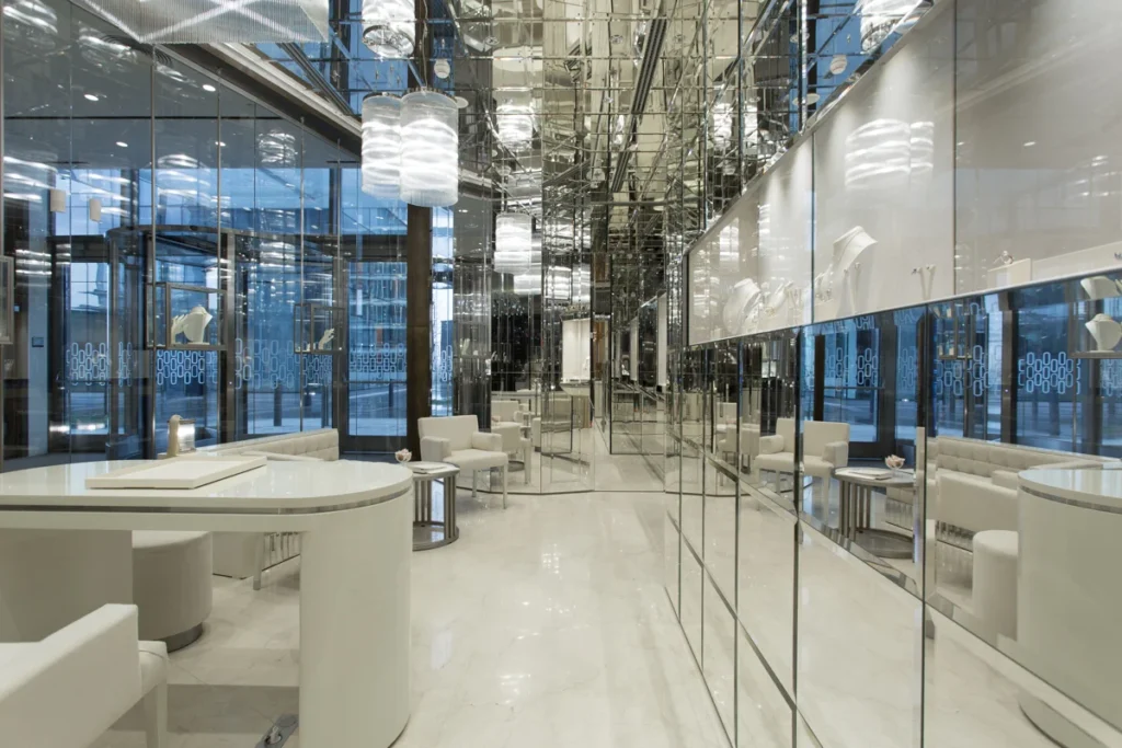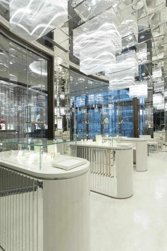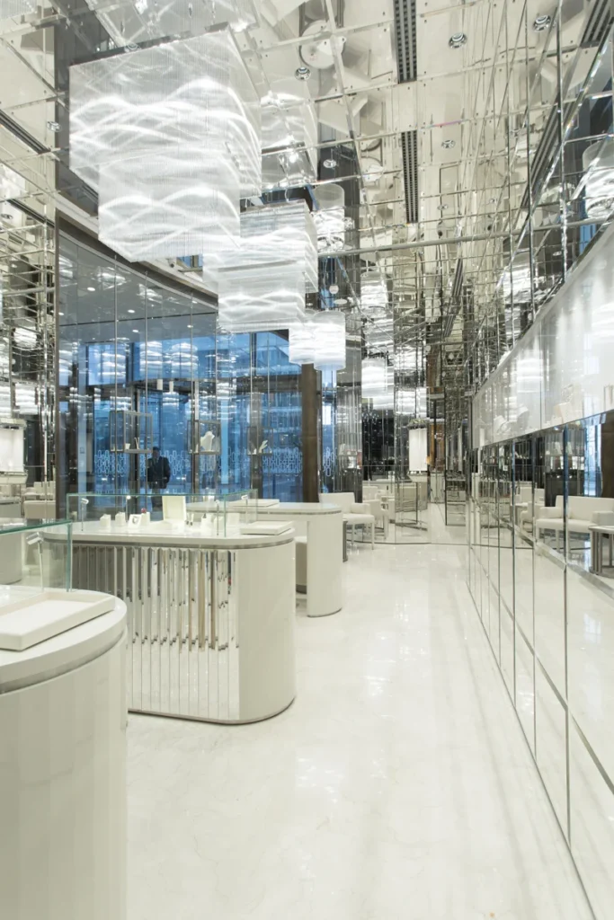 Its owner, Yana Raskovalova, has her fingers in many pies; next to jewelry, she also designs shoes, bags and clothes. We first met the entrepreneur and her interior designer Gonzalo Mendiola at Maison & Objet fair in Paris a few years ago, as they were looking for inspiration for Yana’s new home in Moscow. The meeting resulted in manufacturing two bespoke chandeliers. Little did we know that we would hear from her soon. Her new designer had very clear ideas about the design of Yana’s jewelry boutique; we don’t lay it thick when we say that the boutique itself is the jewel of the shopping mall. The dazzling interior is made up of mirrors and reflections, thus epitomizing the word luxury in its truest form. The cherry on this sparkling cake is our contribution consisting of three Monaco chandeliers and matching Nizza table lamps. The delicate glass tubes are wondrously multiplied by the mirrors, and so are the playful reflections, making the shopping experience one of a kind delight. As the only colour in the shop beside white was silver, we were asked to manufacture the lamps in shiny nickel finish. We were also asked for a five week deadline, which we happily accepted.