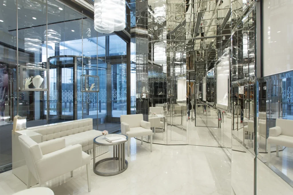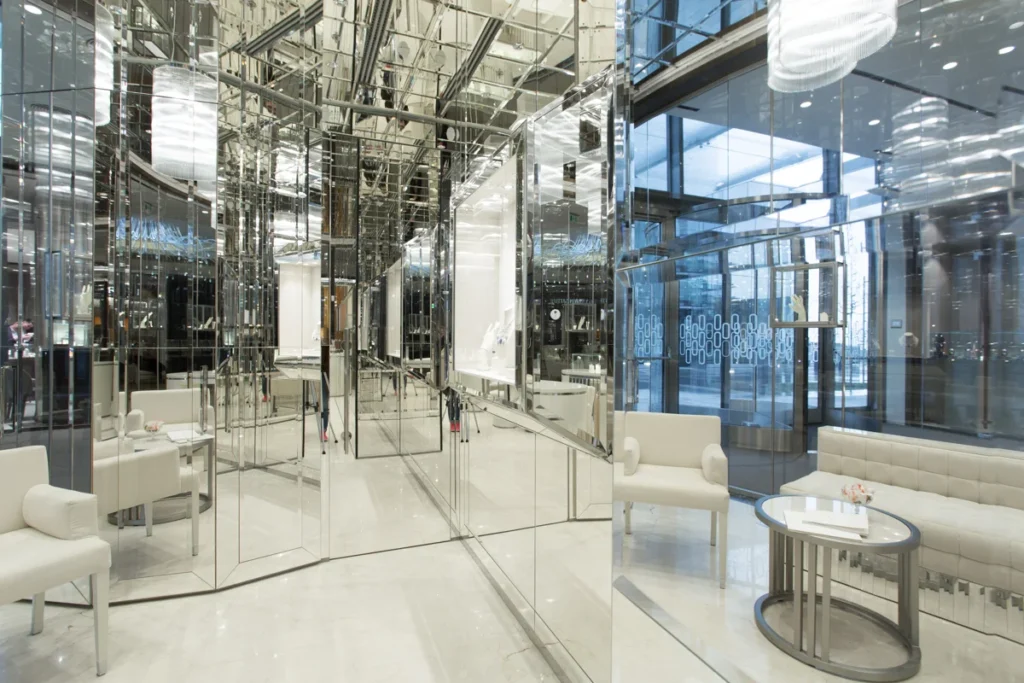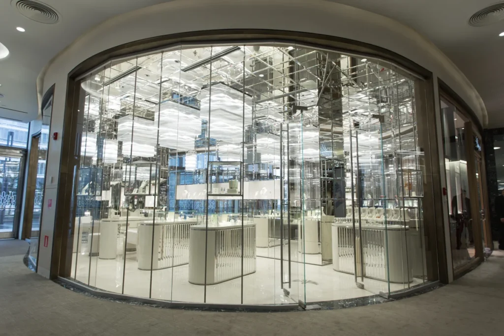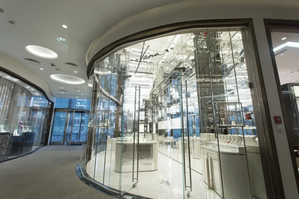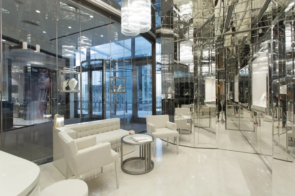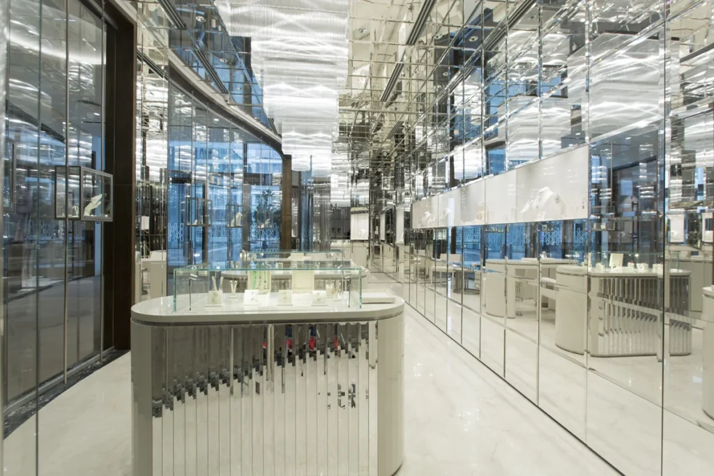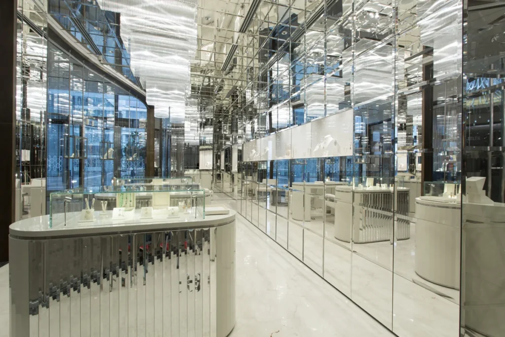 Its owner, Yana Raskovalova, has her fingers in many pies; next to jewelry, she also designs shoes, bags and clothes. We first met the entrepreneur and her interior designer Gonzalo Mendiola at Maison & Objet fair in Paris a few years ago, as they were looking for inspiration for Yana’s new home in Moscow. The meeting resulted in manufacturing two bespoke chandeliers. Little did we know that we would hear from her soon. Her new designer had very clear ideas about the design of Yana’s jewelry boutique; we don’t lay it thick when we say that the boutique itself is the jewel of the shopping mall. The dazzling interior is made up of mirrors and reflections, thus epitomizing the word luxury in its truest form. The cherry on this sparkling cake is our contribution consisting of three Monaco chandeliers and matching Nizza table lamps. The delicate glass tubes are wondrously multiplied by the mirrors, and so are the playful reflections, making the shopping experience one of a kind delight. As the only colour in the shop beside white was silver, we were asked to manufacture the lamps in shiny nickel finish. We were also asked for a five week deadline, which we happily accepted.